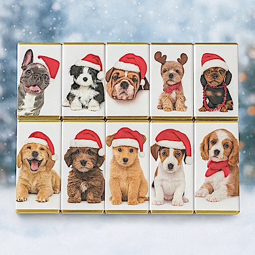 These little Holiday Doggies come from England. That's the right way to beautifully wrap bite size holiday Chocolates!