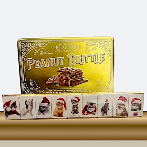 Especially for the cat lover in your life, we've got bite size chocolates with cute cats on the wrapper just in time for the holidays! We're also adding this Delicious Large Golden Box of Peanut Brittle. Perfect for the holidays!
